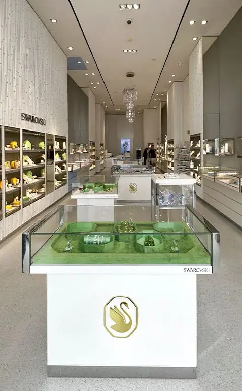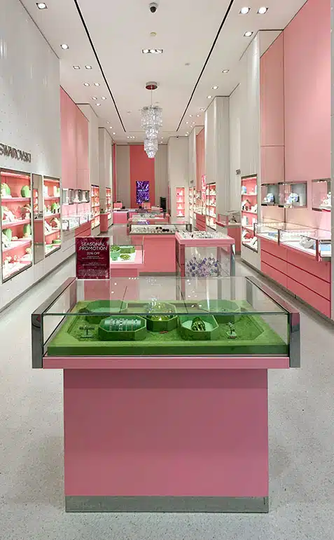 We resurfaced casework at five Swarovski locations, shifting from white to pink to match a rebranding campaign—all done overnight with no disruptions.