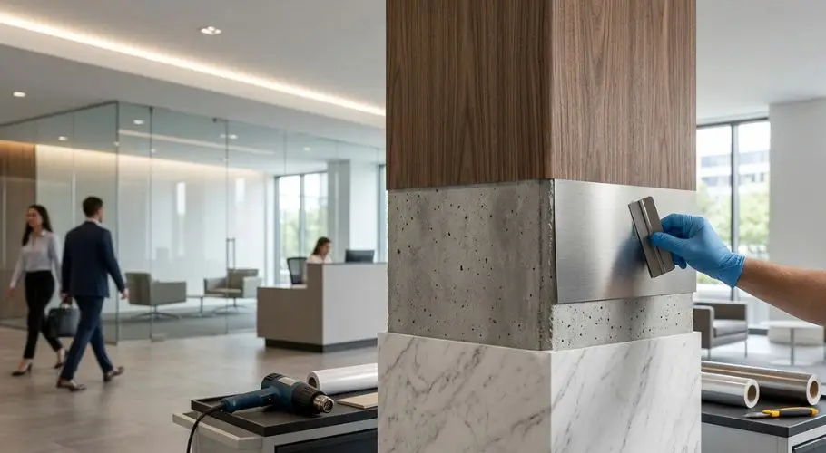 Architectural film wraps work well in this sector because they can be replaced without a full renovation. Hospitality projects can refresh the look of doors, elevators, wall panels, and furniture at a lower cost and with less disruption than replacing the underlying materials.